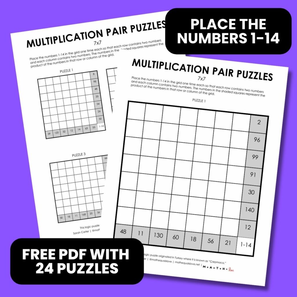 You’ll need logic and multiplication skills to solve these free printable 1-14 multiplication pair puzzles that involve placing numbers on a 7×7 grid.