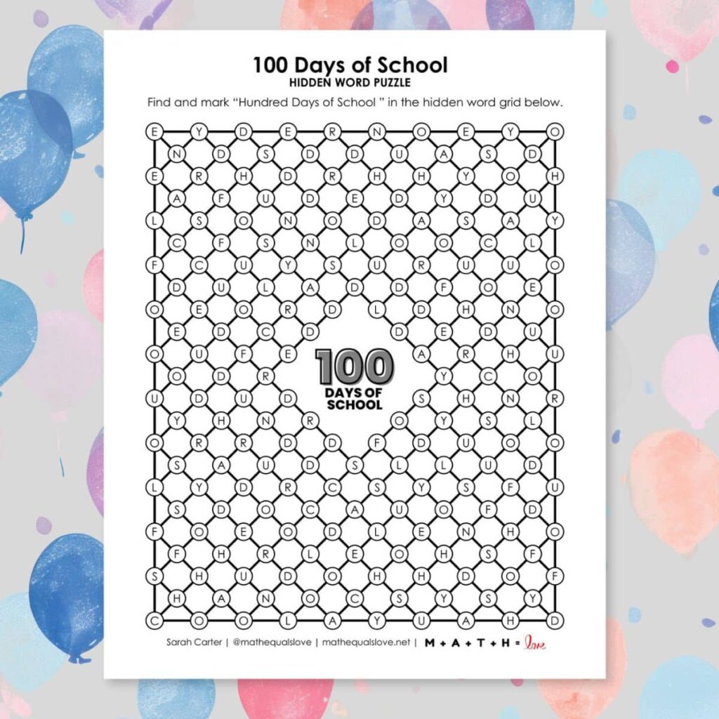 Free Download of Hundred Days of School Hidden Word Puzzle