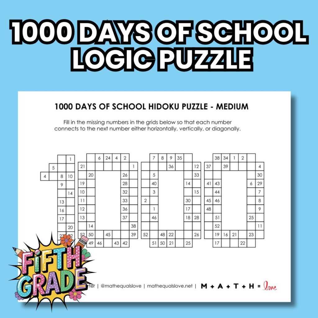 1000 days of school hidoku puzzle activity for 5th grade.