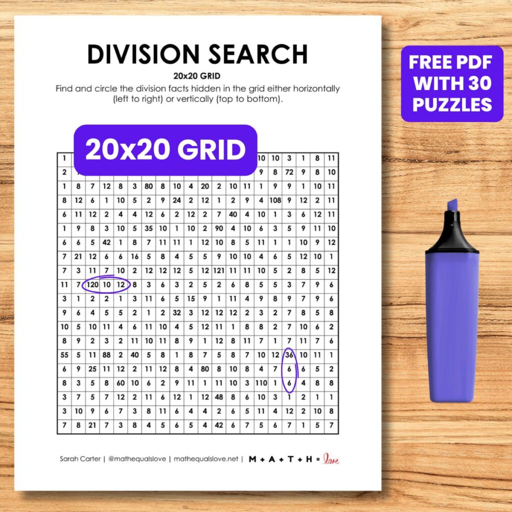 These 20×20 Division Search Puzzles are available as a printable PDF file and an editable PowerPoint file. The PPT file will need to be unzipped before it can be opened/edited.
