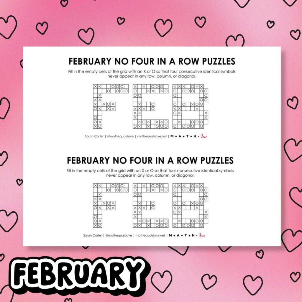Click here to SAVE the file to your device.February No Four in a Row Puzzles (PPT in ZIP)