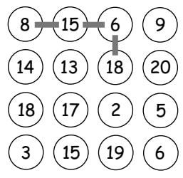 Join any four numbers on a 4×4 grid filled with integers. Students can create their own or the teacher could provide a grid already filled. Find the total of the four joined numbers.