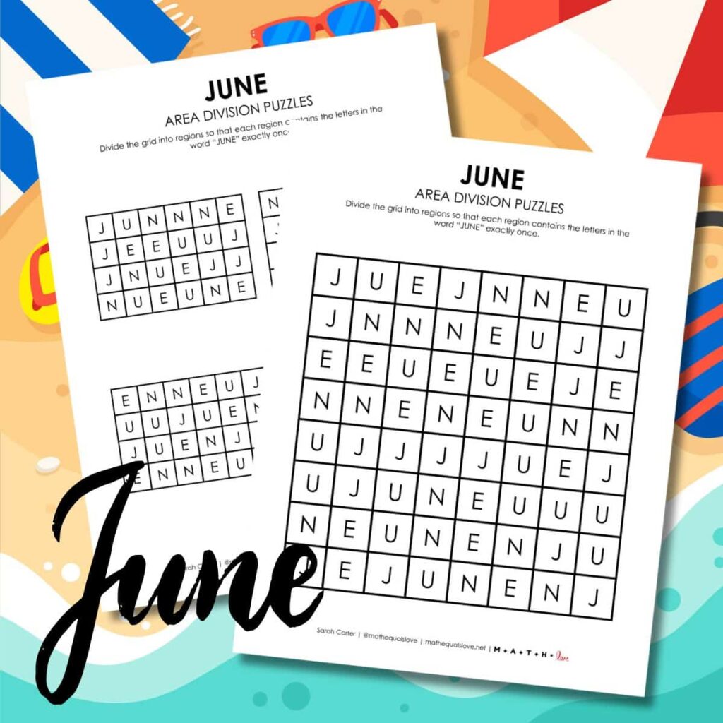 Can you divide the grids into subsections so that each section contains the letters in the word “JUNE?” This logic puzzle is perfect for the month of June!