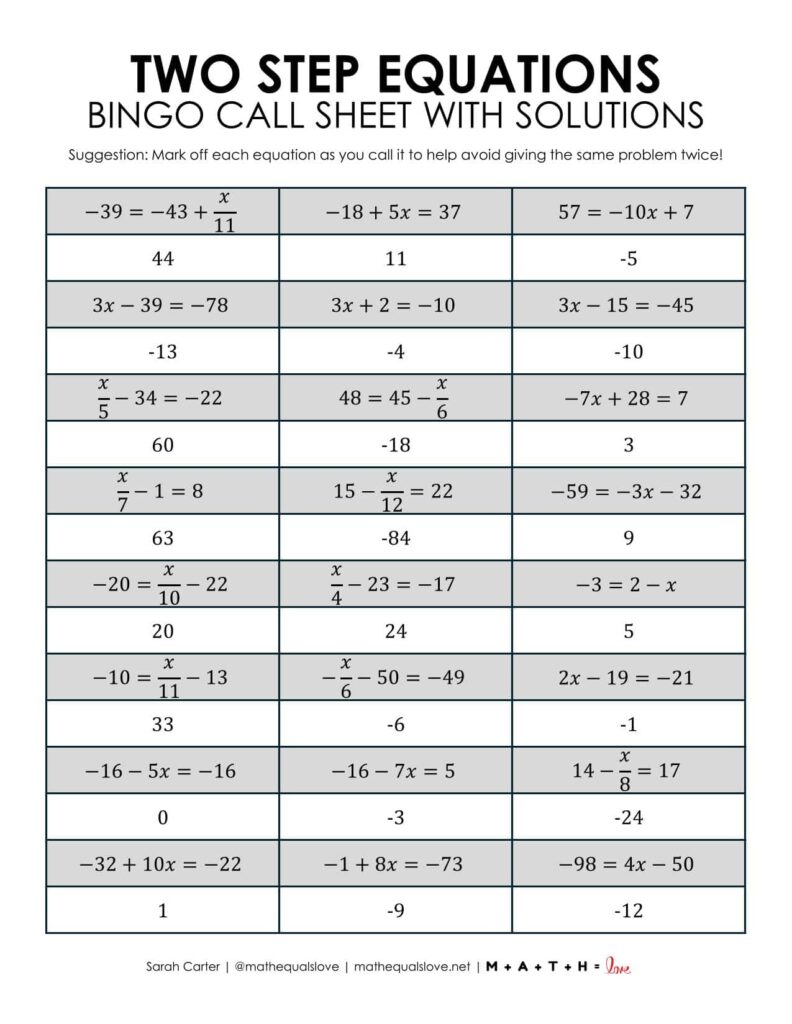 Two Step Equation Bingo Game Printable Files
